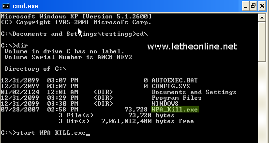 El simbolo de sistema es basicamente DOS. Para llegar al disco o directorio C, digitas cd\ y presionas Enter. Al digitar DIR puedes ver la lista de archivos en este directorio. Y como esta resaltado en la imagen, podemos ver la utilidad WPA_KILL.exe. Ahora para ejecutar la utilidad, digitamos start WPA_KILL.exe